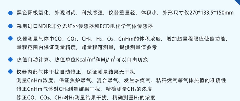 采用自主知識產(chǎn)權的NDIR非分光紅外技術,主要用于測量氣體中的CO、CO2、CH4、C3H8、SO2、NO等氣體的體積濃度及熱值。全進口傳感器、測量精度高、結構簡單、維護方便,軟件功能強大,可拓展性強、現(xiàn)場實用性好,目前暢銷國內外。