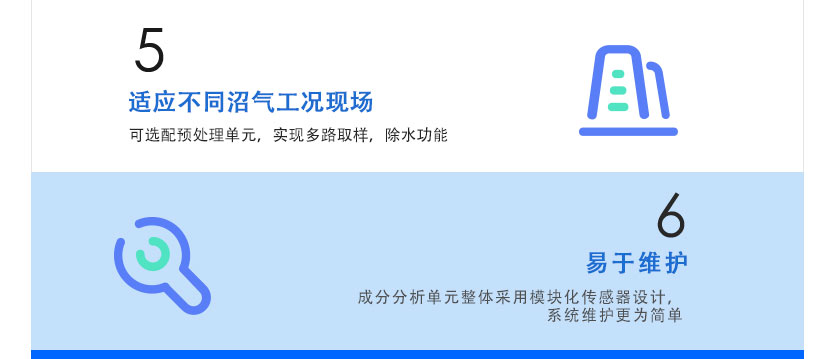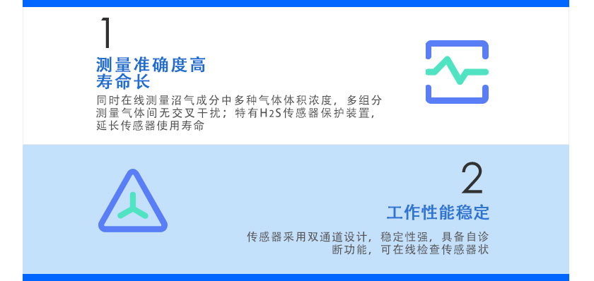 采用進(jìn)口NDIR非分光紅外傳感器,長壽命電化學(xué)傳感器,運用先進(jìn)的數(shù)字處理技術(shù),可同時測量沼氣中CH4、CO2、H2S、O2、CO、H2的體積濃度,根據(jù)氣體濃度值快速準(zhǔn)確計算出相應(yīng)的熱值。