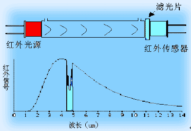 由于各種物質分子內部結構的不同,就決定了它們對不同波長光線的選擇吸收,即物質只能吸收一定波長的光。物質對一定波長光的吸收關系服從朗伯—比爾(Lambert2Beer)吸收定律。下圖為NDIR紅外氣體分析原理圖:以CO2分析為例,紅外光源發射出120μm的紅外光,通過一定長度的氣室吸后,經過一個4.26μm波長的窄帶濾光片后,由紅外傳感器監測透過4.26μm波長紅外光的強度,以此表示CO2氣體的濃度。