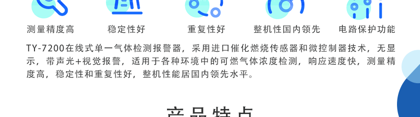 • 在線式單一氣體檢測報警器(無顯示) TY-7200 采用進口催化燃燒傳感器和微控制器技術,無顯示,無聲光+視覺報警,適用于各種環境中的可燃氣體濃度檢測,響應速度快,測量精度高,穩定性和重復性好,整機性能居國內領先水平。儀器具有多種超強的電路保護功能,可防止錯接電源、反接電源、電源短路、電源不穩、電源與信號錯解等,導致的儀器損壞。