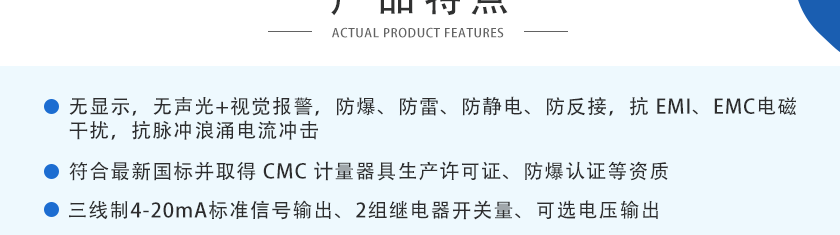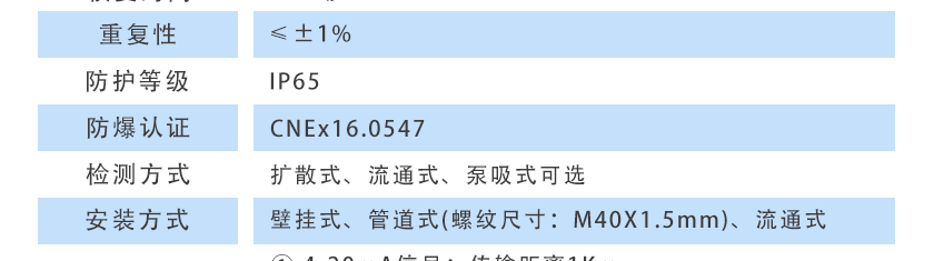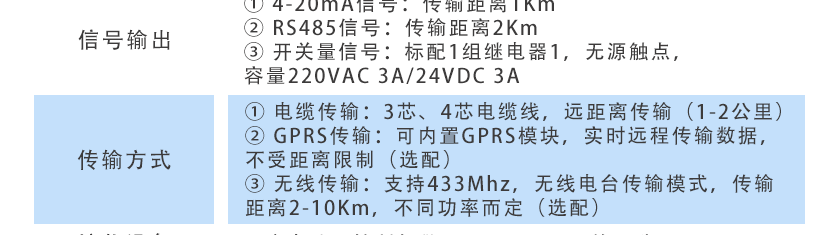 ①4-20mA信號傳輸距離1Km ②RS485信號傳輸距離2Km