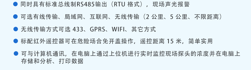 ①電纜傳輸3芯、4芯電纜線,遠距離傳輸(1-2公里)②GPRS傳輸可內置GPRS模塊,實時遠程傳輸數據,不受距離限制(選配)③無線傳輸支持433Mhz,無線電臺傳輸模式,傳輸距離2-10Km,不同功率而定(選配)