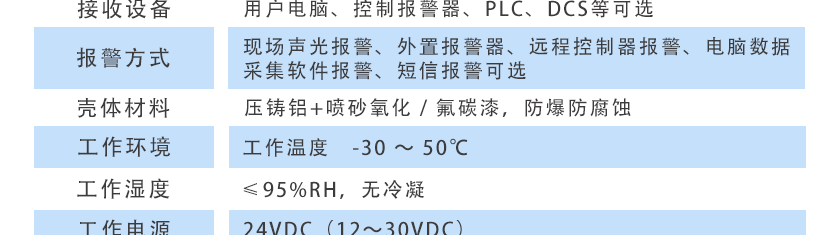 現場聲光報警、外置報警器、遠程控制器報警、電腦數據采集軟件報警、短信報警可選