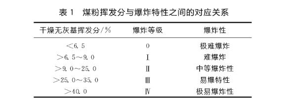 (1)煤粉的揮發分。一般來講,揮發分越高、發熱量越高、活性越高、活化能越低,越容易爆炸。揮發分Vdaf<6.5%,煤粉幾乎不爆炸,Vdaf>25%時煤粉就容易發生自燃,爆炸的危險性增強。煤粉的揮發性和爆炸特性之間的對應關系見表1。