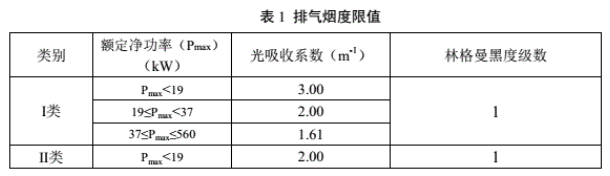 (2)煙度限值:非道路柴油移動(dòng)機(jī)械排氣的不透光法煙度(光吸收系數(shù))和林格曼黑度系數(shù)不應(yīng)超過(guò)表1規(guī)定得限值。
