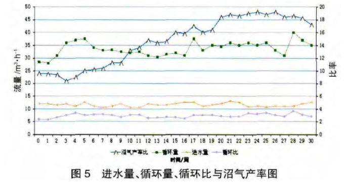 圖5為進水量、循環(huán)量、循環(huán)比與沼氣產(chǎn)率圖,從圖中可以看出,厭氧反應器進水達到設計流量12.5m3/h左右時,厭氧反應器出水循環(huán)量大都集中在30~40m3/h,循環(huán)比在250%~320%內波動,1m3滲濾液沼氣的產(chǎn)率約9~19m3,沼氣的產(chǎn)率系數(shù)為每去除1kgCOD產(chǎn)生0.5m3沼氣,沼氣產(chǎn)率與COD產(chǎn)率線性相關,COD的去除率直接影響到沼氣的產(chǎn)率。