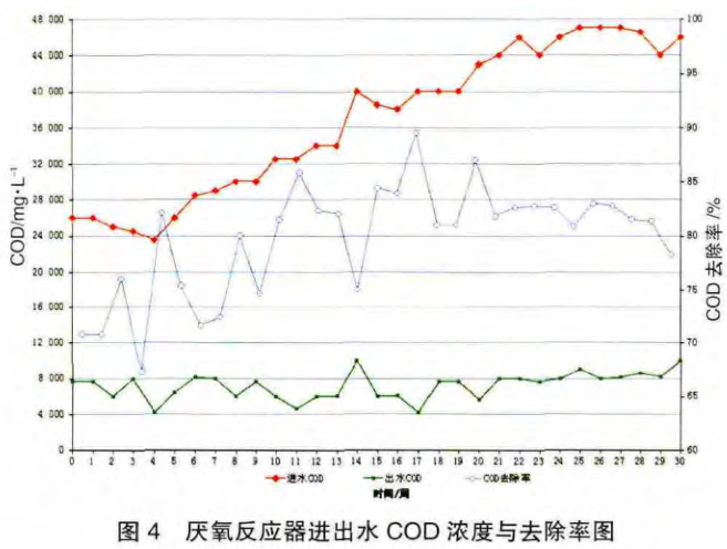 從圖4可以看出,在25?27周,厭氧反應器進水COD值最高為46000mg/L左右,出水C0D在8000?9000mg/L內波動,COD去除率為80.4% ~82.6%。厭氧反應器出水中VFA濃度為2000~3000mg/L,較高的VFA有助于后續(xù)的好氧生物處理。