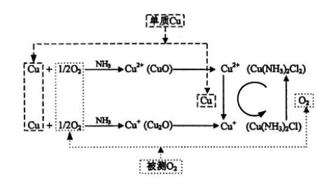 所生成的氧化銅和氧化亞銅分別與氨水、氯化銨作用,生成可溶性的高價(jià)(+2價(jià))銅鹽Cu(NH3)2Cl2和低價(jià)(+1價(jià))銅鹽Cu2(NH3)2Cl2。低價(jià)銅鹽吸收氧氣轉(zhuǎn)成高價(jià)銅鹽,高價(jià)銅鹽又被銅還原成低價(jià)銅鹽,如此循環(huán)作用,直到混合氣體中的氧氣耗完為止。根據(jù)氣體體積的減少量即可得到氣體中的氧含量(體積百分比濃度)。在整個(gè)測量過程中,只要溶液中有足夠的純銅存在,就能保證化學(xué)反應(yīng)的持續(xù)進(jìn)行。