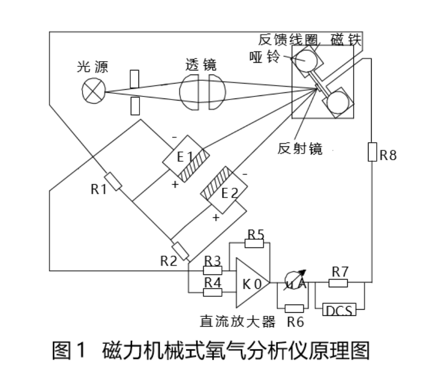 1.1磁機(jī)械式氧分析原理:由于氧氣分子具有較強(qiáng)的順磁性,氧氣分子會(huì)向著磁場(chǎng)增強(qiáng)的方向移動(dòng)。通過(guò)兩種不同的氧含量氣體在磁場(chǎng)作用下所形成的的壓力差,并根據(jù)機(jī)械原理采用一根極為靈敏的鋼絲來(lái)懸吊啞鈴球,兩種不同的氧含量氣體在磁場(chǎng)中的壓力差會(huì)使偏移,而啞鈴球偏轉(zhuǎn)角度與混合氣體中含氧量濃度成正比,并由特定的光源、反射鏡以及感光原件所組成單元準(zhǔn)確地測(cè)定出啞鈴球的偏轉(zhuǎn)角度,進(jìn)而確定混合氣體中氧含量的百分比。