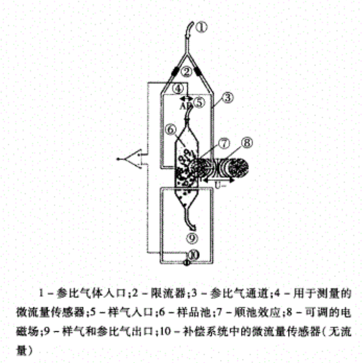 2.1 磁壓力式氧分析儀原理:利用被測(cè)氣體中的氧分子在磁場(chǎng)作用下壓力發(fā)生變化來(lái)進(jìn)行測(cè)量。一般為在同一磁場(chǎng)中,同時(shí)引入兩種磁化率不同的氣體,樣氣從入口進(jìn)入測(cè)量室,而參比氣(空氣、氮?dú)饣蜓鯕猓┙?jīng)入口進(jìn)去后分兩路進(jìn)入測(cè)量室,在參比氣的兩個(gè)通道間有一根連接管,中間安裝有微流量傳感器。當(dāng)電磁鐵通電勵(lì)磁時(shí),其周圍形成一個(gè)磁場(chǎng),導(dǎo)致參比氣右側(cè)通道內(nèi)的氣體和氧氣中的氧分子被磁場(chǎng)吸引發(fā)生偏轉(zhuǎn)后再流出樣品池,這樣就造成參比氣右側(cè)壓力升高。參比氣兩路氣壓不對(duì)等,從而推動(dòng)參比氣逆時(shí)針流動(dòng)并穿過(guò)微流量傳感器產(chǎn)生信號(hào)。當(dāng)電磁鐵斷電去磁時(shí),磁場(chǎng)消失,因壓力差氣體會(huì)順時(shí)針流動(dòng)反向穿過(guò)微流量傳感器并產(chǎn)生輸出信號(hào)。當(dāng)采用一定頻率的通斷電流對(duì)電磁鐵反復(fù)勵(lì)磁和消磁,便可在測(cè)量橋路中得到交流波動(dòng)信號(hào),信號(hào)波動(dòng)的幅值正比于樣氣中的氧氣含量。當(dāng)參比氣體確定后,參數(shù)均為已知數(shù)值,被測(cè)氣體氧的濃度與壓差就有線性關(guān)系,從而可以準(zhǔn)確測(cè)量氧含量。