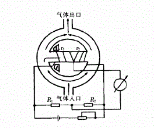 在一個(gè)中間有通道的環(huán)形氣室內(nèi),外面均勻繞著電阻絲,電阻絲通入電流后既起到加熱的作用,同時(shí)又是測(cè)量溫度變化的感溫元件。電阻絲從中間一分為二,作為兩個(gè)相鄰的橋臂電阻r1、r2,與固定電阻R1、R2組成測(cè)量電橋。在中間通道的左側(cè)設(shè)置一對(duì)小電極,以形成恒定的不均勻的磁場(chǎng)。待測(cè)氣體從底部人口進(jìn)人環(huán)形氣室后,由于受到磁場(chǎng)的吸引而進(jìn)入水平通道,當(dāng)它處于磁場(chǎng)強(qiáng)度最大的區(qū)域時(shí),也同時(shí)被電阻絲加熱。在加熱區(qū)被測(cè)氣體溫度升高,電阻絲溫度降低。被加熱的氣體由于溫度升高,體積磁化率將急劇下降,受磁場(chǎng)的吸引力也就大為減弱。而其后冷態(tài)的順磁性氣體在磁場(chǎng)的作用下繼續(xù)被吸引到磁場(chǎng)強(qiáng)度最大的區(qū)域,這就對(duì)先前已受熱的順磁性氣體產(chǎn)生向右方向的推力,使其流動(dòng)而脫離磁場(chǎng)區(qū)域。如此周而復(fù)始,形成"磁風(fēng)"。當(dāng)被測(cè)氣體的磁化強(qiáng)度(即氧含量)越大,形成的"磁風(fēng)"越強(qiáng),帶走電阻絲的熱量就越多,電阻絲的阻值就變化越大,阻值的變化與被測(cè)氣體中的氧含量呈正比關(guān)系,因此可對(duì)被測(cè)氣體中的氧含量進(jìn)行測(cè)量。