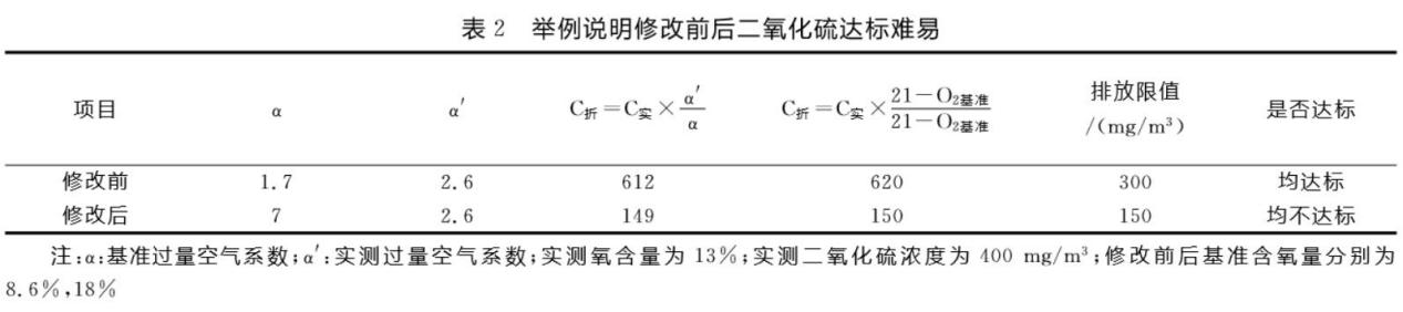 從以上對照表(表1)可以看出,修改單將基準含氧量更改為18%,這樣更切合隧道窯工藝實際情況,關鍵點就在這里,因磚瓦窯含氧量一般在17%~20%。二氧化硫的排放限值由300 mg/m3調整為150 mg/m3,看似更加嚴厲,其實較之前更容易達標。例如某隧道窯實測含氧量為13%,二氧化硫實測濃度為 400 mg/m2,按照修改前后計算是否達標,見表2。