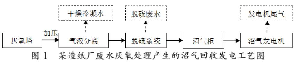 某造紙廠廢水厭氧處理產生的沼氣回收發電工藝說明(1)廢水治理設施中的厭氧塔在厭氧處理過程中產生的沼氣經加壓風機加壓推進氣液分離器中干燥氣體,減少沼氣從厭氧塔中所帶出的水分,該過程有干燥冷凝水產生;(2)干燥后的沼氣進入脫硫塔中進行濕式催化氧化脫硫去除沼氣中少量的H2S,減輕H2S在燃燒過程中產生的SO2該過程中有脫硫廢水產生;(3)預處理去H2S后的沼氣暫存在沼氣柜中,使用時進入沼氣發電機中燃燒發電。