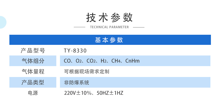 • 在線紅外氣體分析儀 TY-6300 在線紅外氣體分析儀TY-6300采用自主知識產權的NDIR非分光紅外技術,主要用于測量CO、CO2、CH4、C3H8、SO2、NO等氣體的體積濃度及熱值。適用于鋼鐵、化工、煤氣化、生物氣化、節能監測、能效測評等領域,測量焦爐煤氣、高爐煤氣、轉爐煤氣、混合煤氣、發生爐煤氣、生物燃氣等可燃氣體不同成分的體積濃度和熱值。