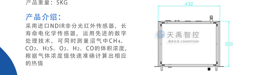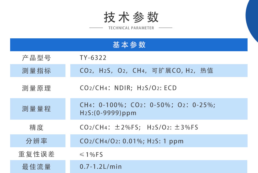 • 壁掛式沼氣分析儀 TY-6090 采用進口NDIR非分光紅外傳感器,長壽命電化學傳感器,運用先進的數字處理技術,可同時測量沼氣中CH4、CO2、H2S、O2、CO、H2的體積濃度,根據氣體濃度值快速準確計算出相應的熱值。