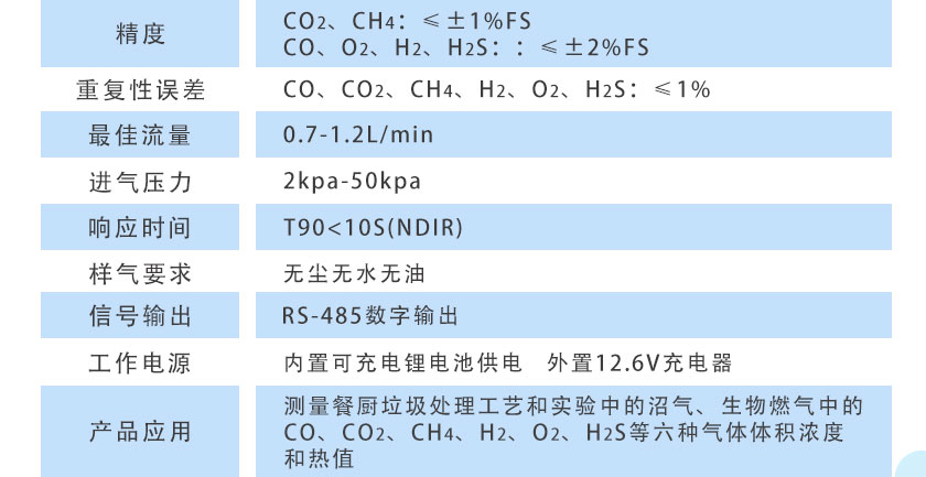 CO2、CH4: ≤±1%FS;CO、O2、H2、H2S: ≤±2%FS