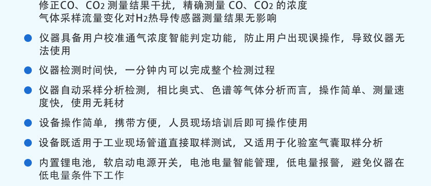 CO:0-75%,CO:20-25% ,CH4:0-40%,H2:0-75%,O2:0-25%,CnHm:0-5%(量程可根據用戶實際需求配置)