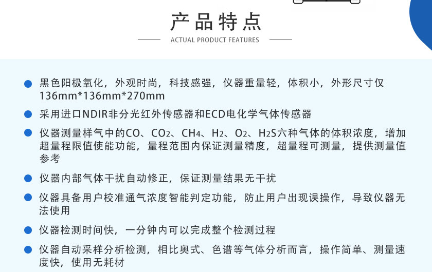 采用國(guó)際先進(jìn)的NDIR非分光紅外技術(shù)和ECD電化學(xué)技術(shù),主要用于測(cè)量垃圾填埋場(chǎng)中的CO、CO2、CH4、H2、O2、H2S等六種氣體體積濃度和燃?xì)鉄嶂怠?