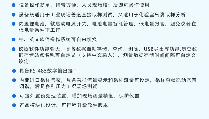 采用國(guó)際先進(jìn)的NDIR非分光紅外技術(shù)和ECD電化學(xué)技術(shù),主要用于測(cè)量餐廚垃圾處理工藝和實(shí)驗(yàn)中的沼氣、生物燃?xì)庵械腃O、CO2、CH4、H2、O2、H2S等六種氣體體積濃度和熱值。