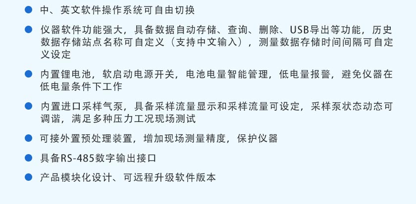 SO2、NO:0~20~100mg/m3;O2:0~25%;CO:0~625mg/m3;CO2:0~65%;(量程可以根據用戶實際需求配置)