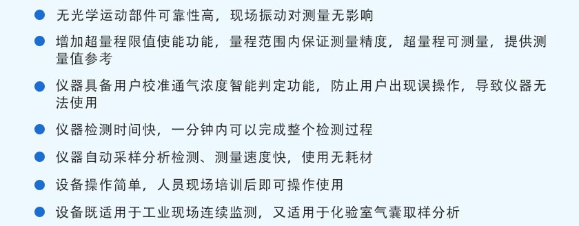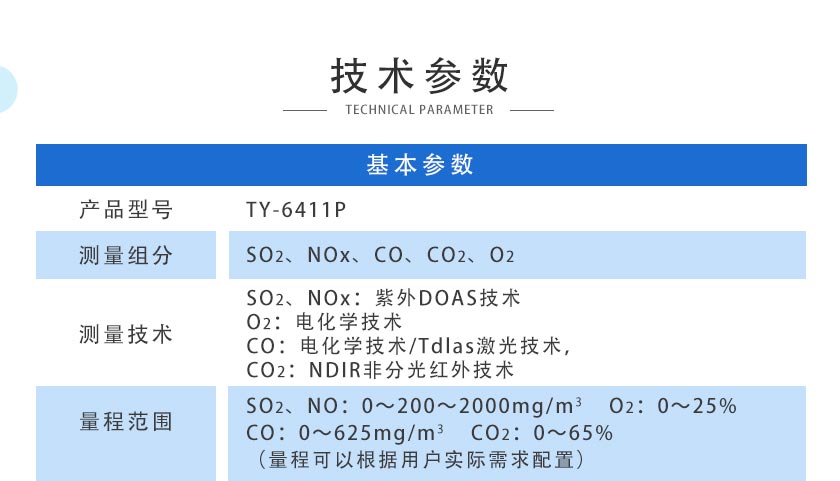 SO2、NOx:紫外DOAS技術;O2:電化學技術;CO:電化學技術/Tdlas激光技術;CO2:NDIR非分光紅外技術