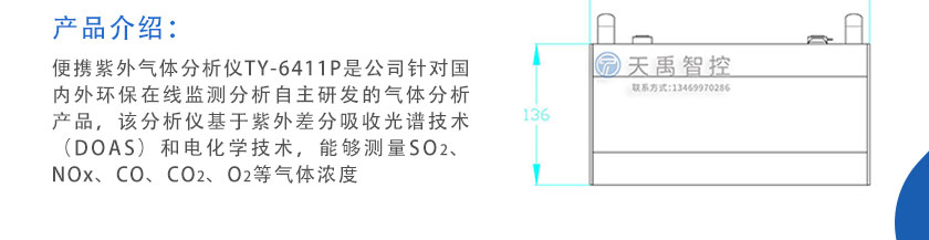 • 便攜紫外氣體分析儀 TY-6400P 該分析儀基于紫外差分吸收光譜技術(DOAS)和化學計量學算法(PLS),能夠測量SO2、NO、NO2、O2、NH3、CO、CO2、Cl2、O3、H2S、HCl、CH3I等氣體濃度,具有測量精度高、可靠性強、運行成本低、響應時間快、量程跨度大、應用范圍廣等特點。